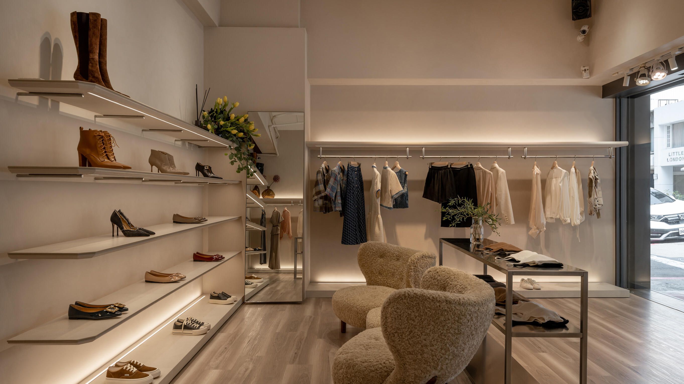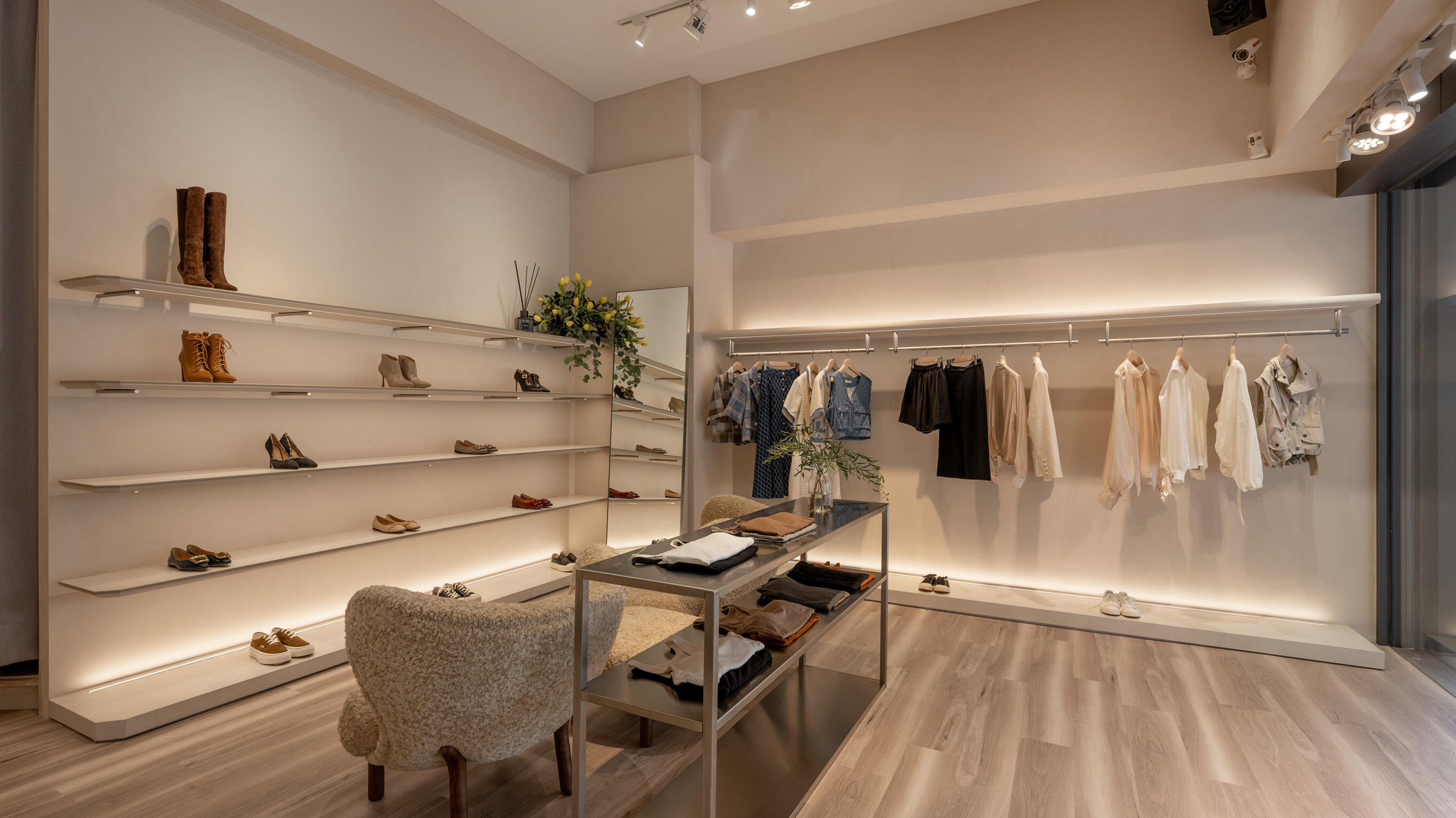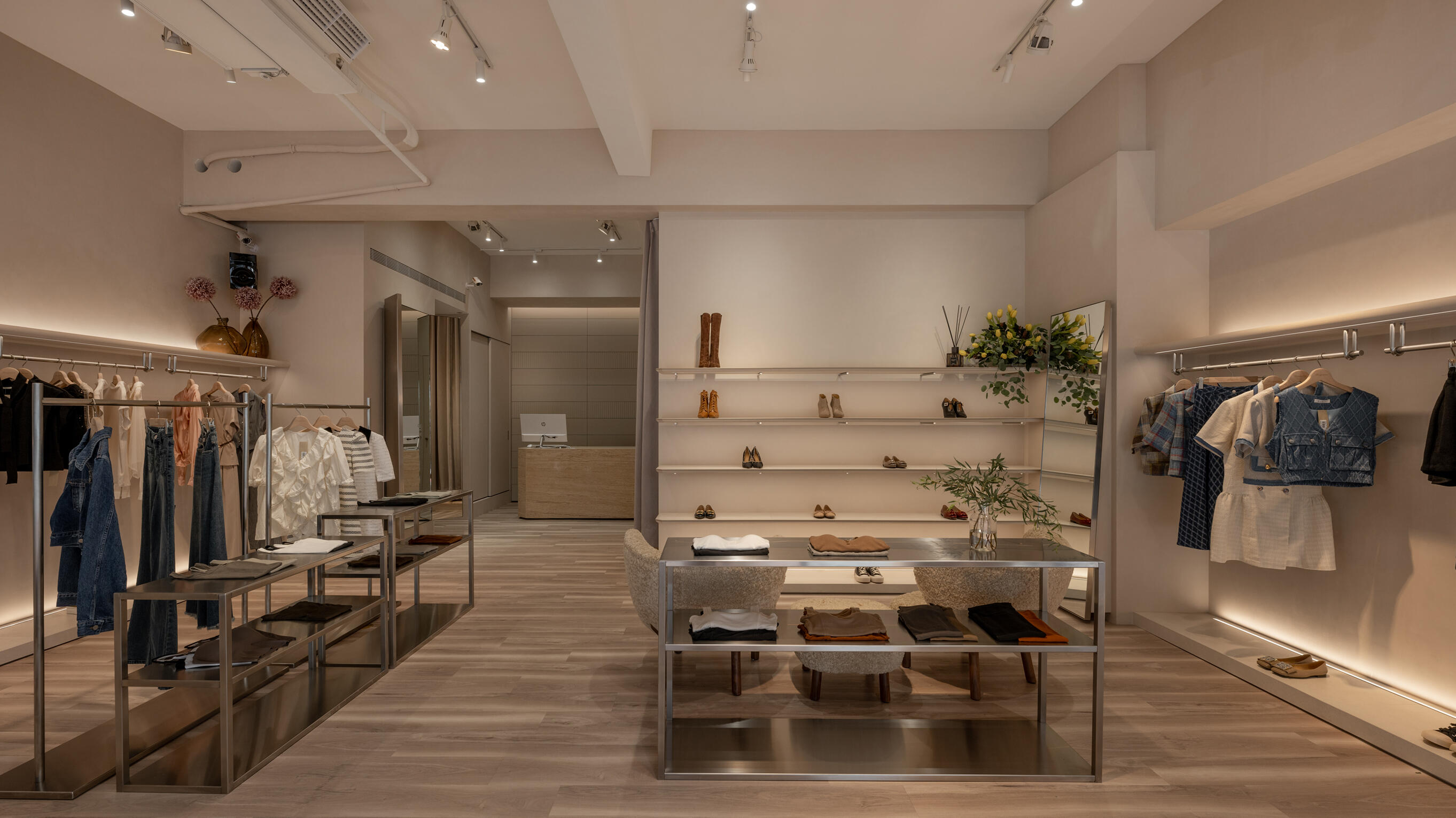 材質的碰撞有助於增添空間的層次感,不鏽鋼層架的冷冽,搭配溫潤的跳色木地板,形成視覺上的反差,營造出溫馨舒適的購物氛圍;隨著間接光的烘托,展現服飾與鞋子的質感。