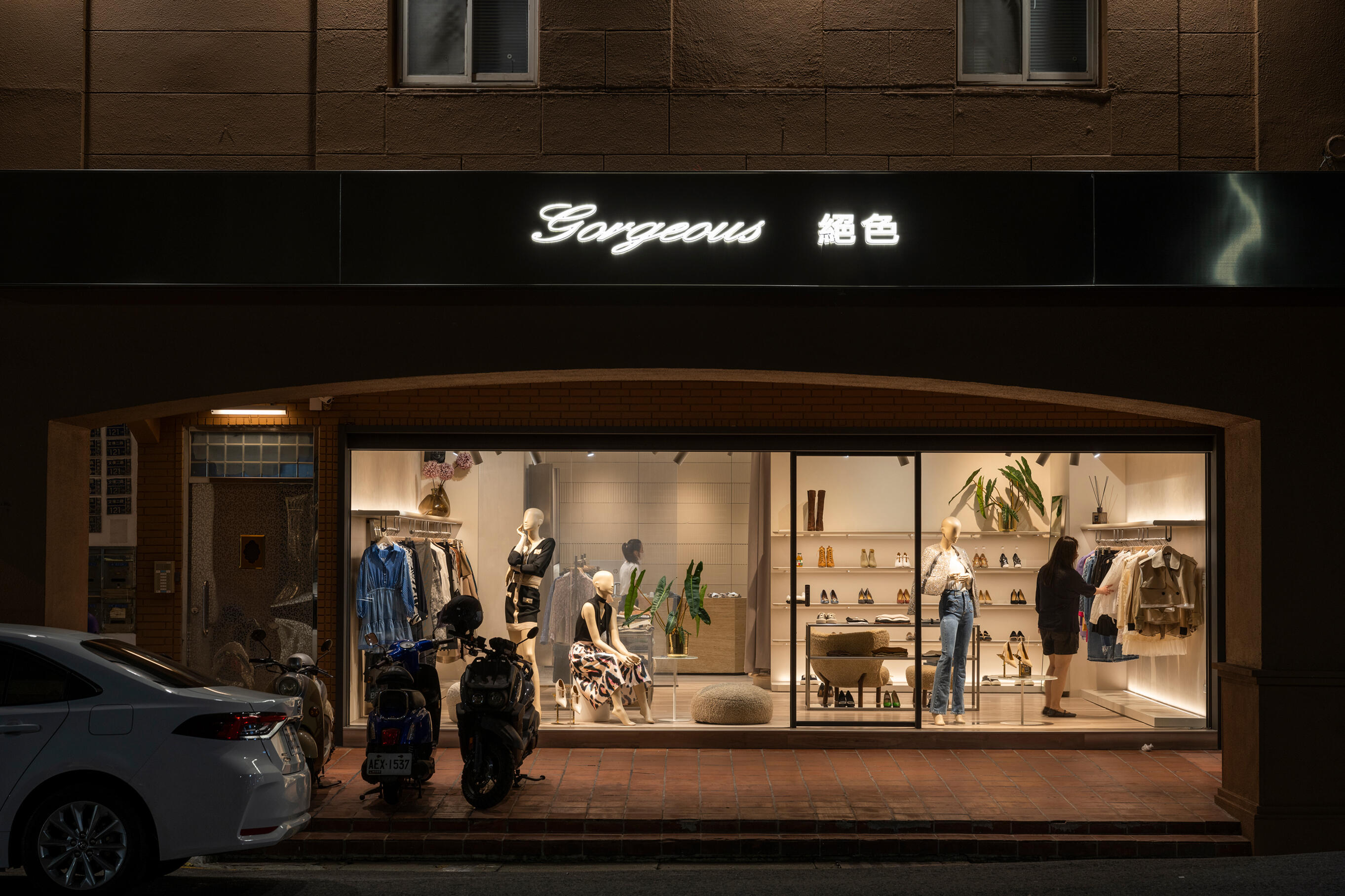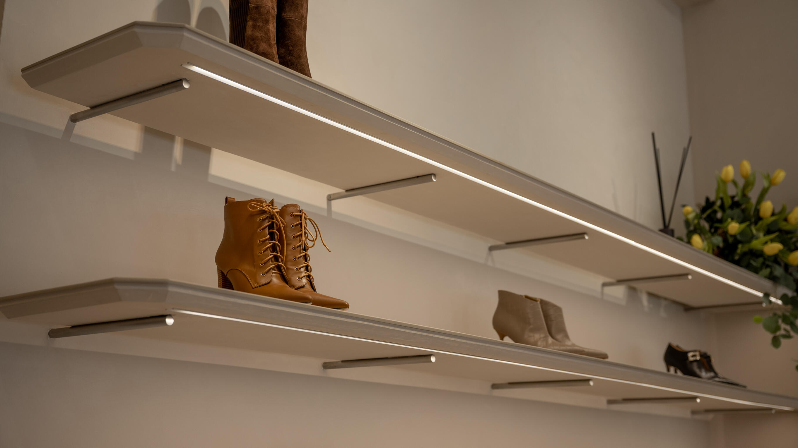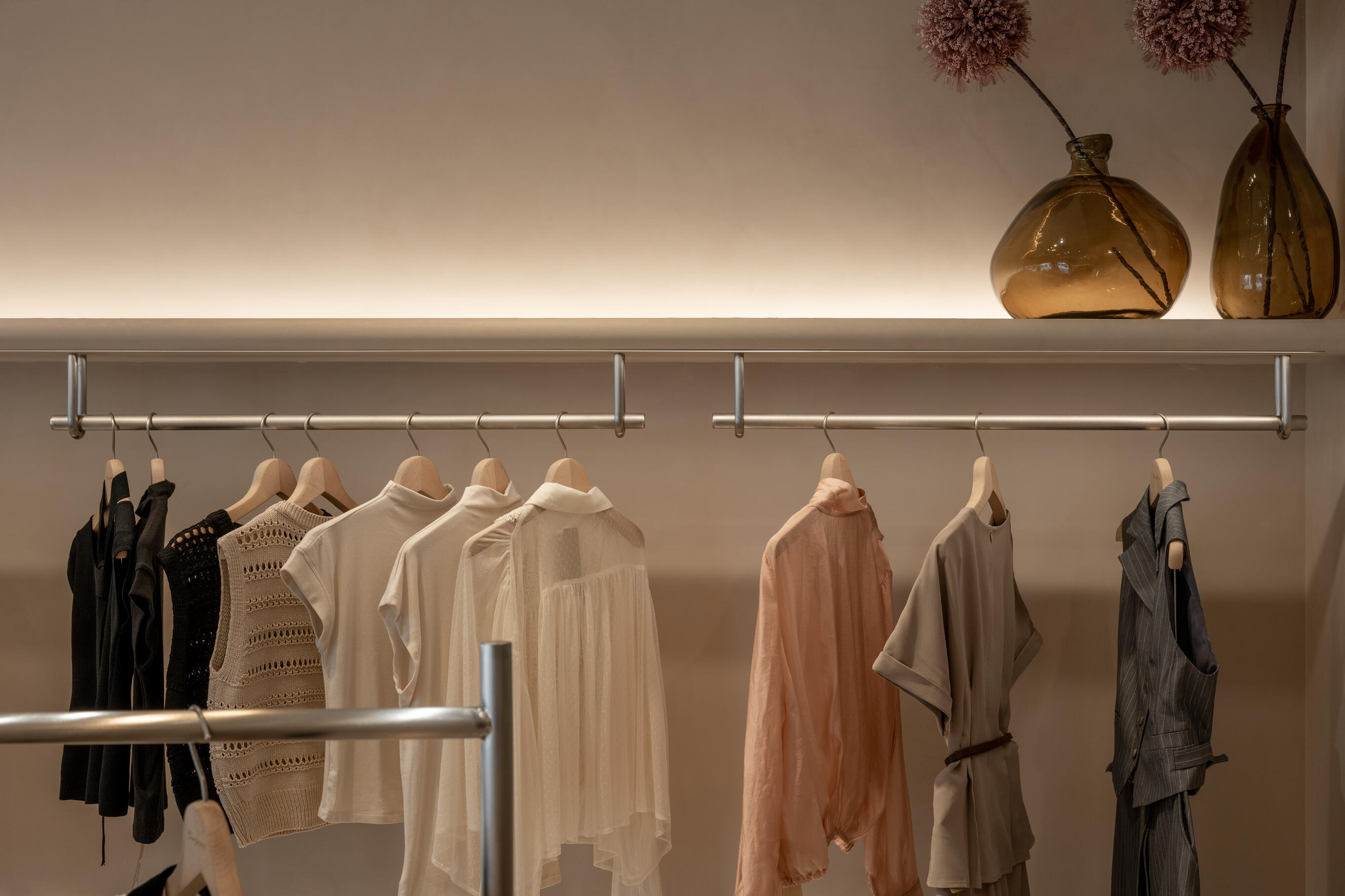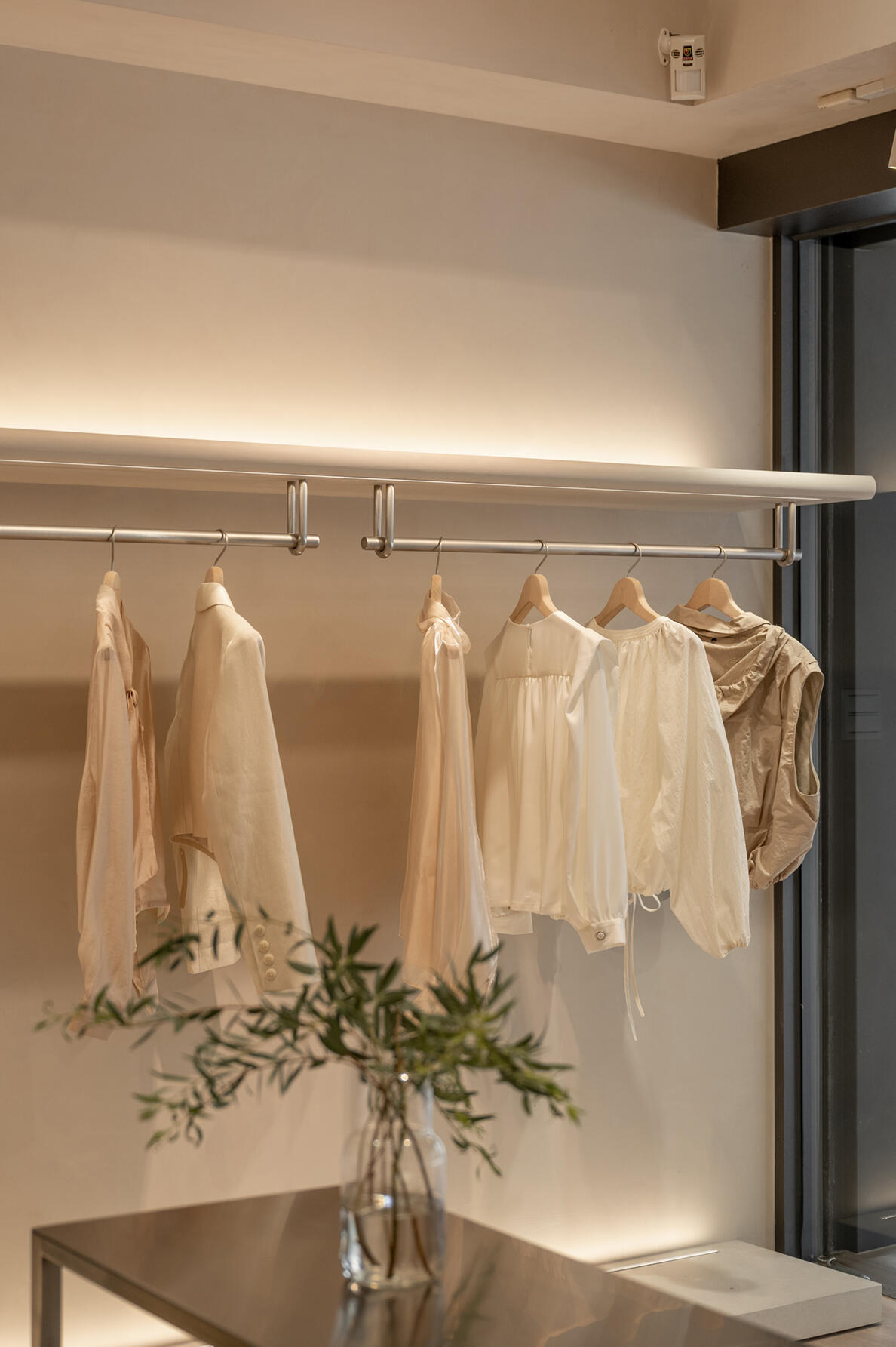 材質的碰撞有助於增添空間的層次感,不鏽鋼層架的冷冽,搭配溫潤的跳色木地板,形成視覺上的反差,營造出溫馨舒適的購物氛圍;隨著間接光的烘托,展現服飾與鞋子的質感。