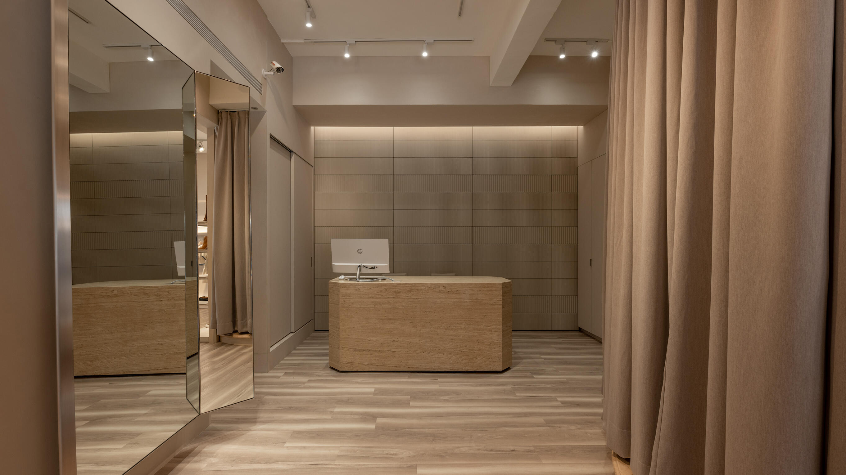 櫃台選用帶有礦石感的洞石材質,其溫潤的色調與自然流動的紋理,為空間注入了一絲自然的氣息與溫度;櫃台主牆選用了皮革條紋飾板,皮革條紋的細膩紋理,與服裝的高級質感相得益彰,為空間帶來低調奢華的氛圍,體現了服飾店室內設計的品味與講究。