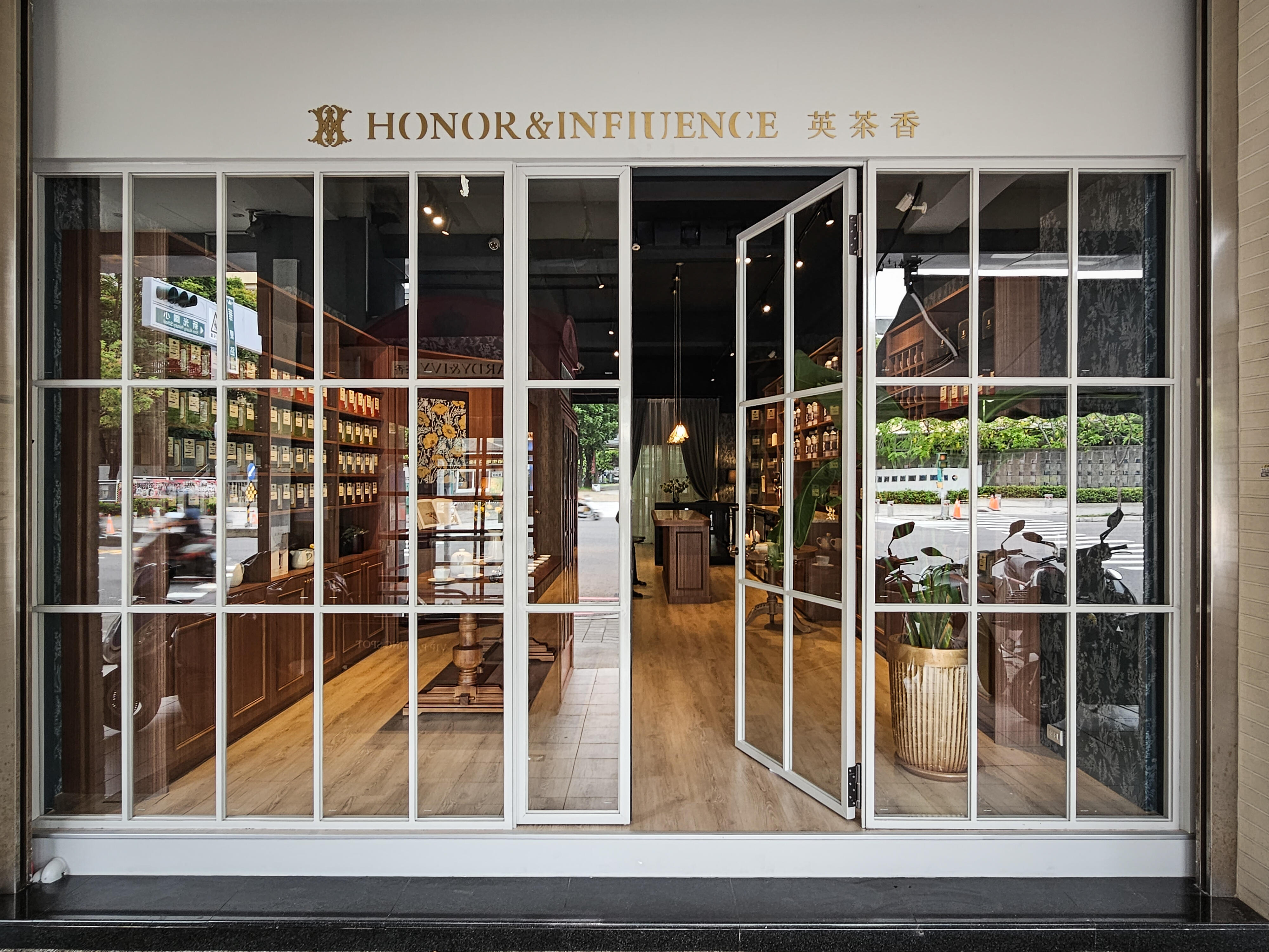門面的設計是帶給顧客的第一印象。門口窗格鑲著透明晶亮的玻璃,白色玻璃門呈現透明潔淨的穿透感,搭配清晰的金色立體招牌,如同英式街邊小店的英式店門面設計,吸引了路過行人的目光,讓他們駐足停下腳步,好奇窺探內部的空間。