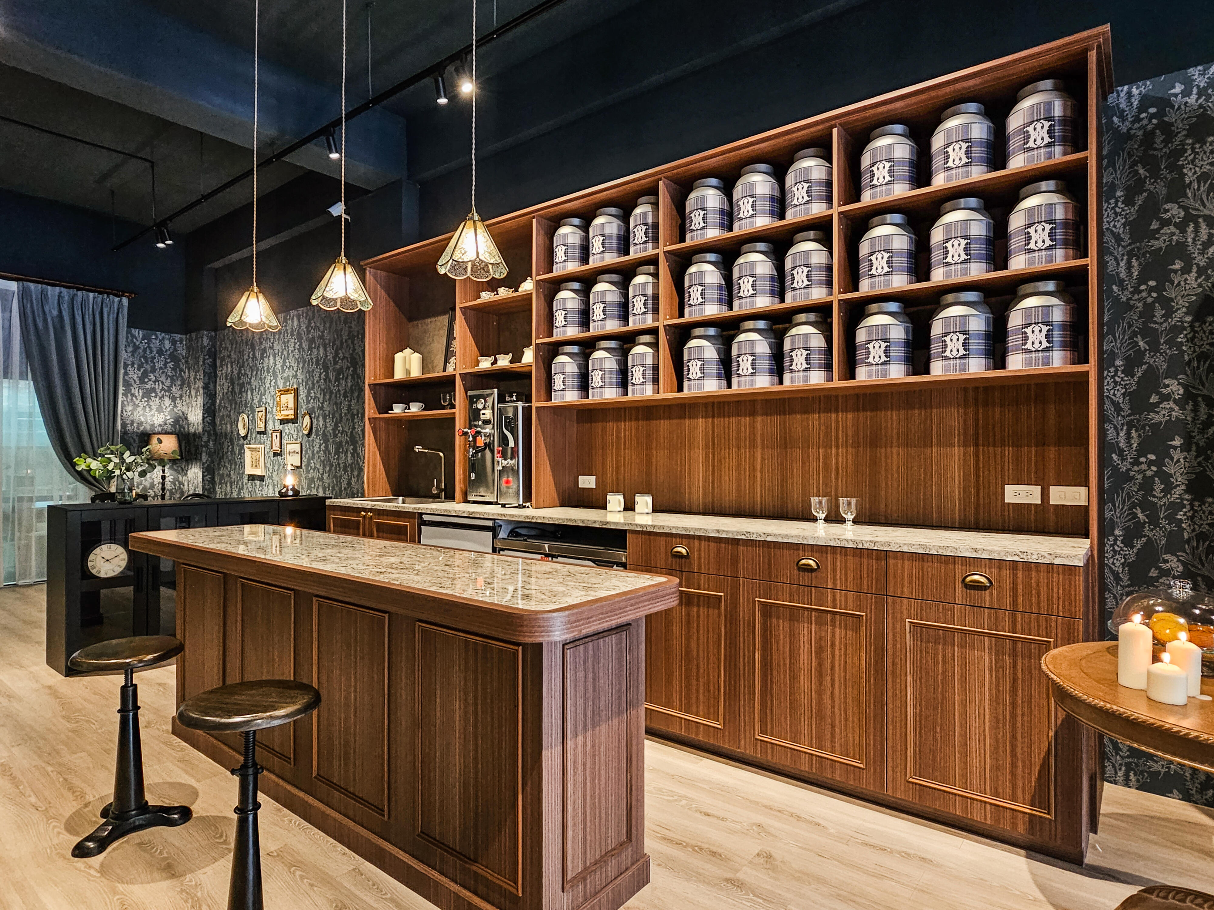 順著店內空間行走來到中島區,中島櫃檯區設計讓仕茶師與顧客能近距離互動品茶,實木中島展現了獨一無二的木紋肌理,搭配造型復古的吊燈,增添了優雅的英式風情。造型椅凳可讓顧客稍作休憩,挑選喜歡的茶品與店員互動,聆聽店員解說每種茶不同的特色介紹,深入了解英式茶文化,並在等待的過程中,欣賞泡茶製作過程的樂趣。