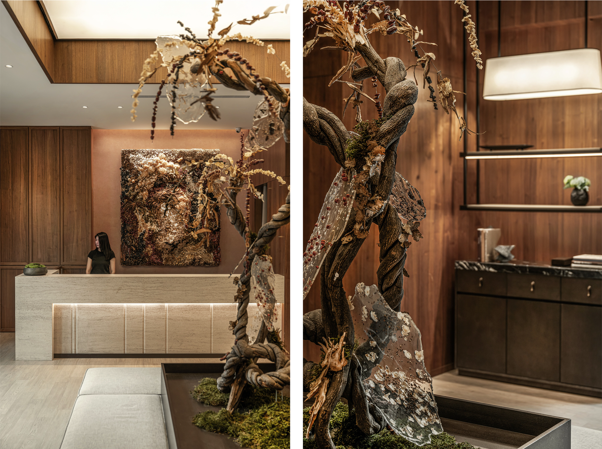 這並非一般植栽,而是將中草藥材以藝術形式呈現,細緻地配置於枝幹之間,成為空間中的視覺焦點,透過這樣的呈現方式,藥材不再只是被收納於抽屜內的素材,而轉化為一種可被觀看、感受的存在。在候診的過程中,視線與情緒自然被引導至這份沉靜而自然的氛圍,使等待本身,也成為一段放鬆的過程。