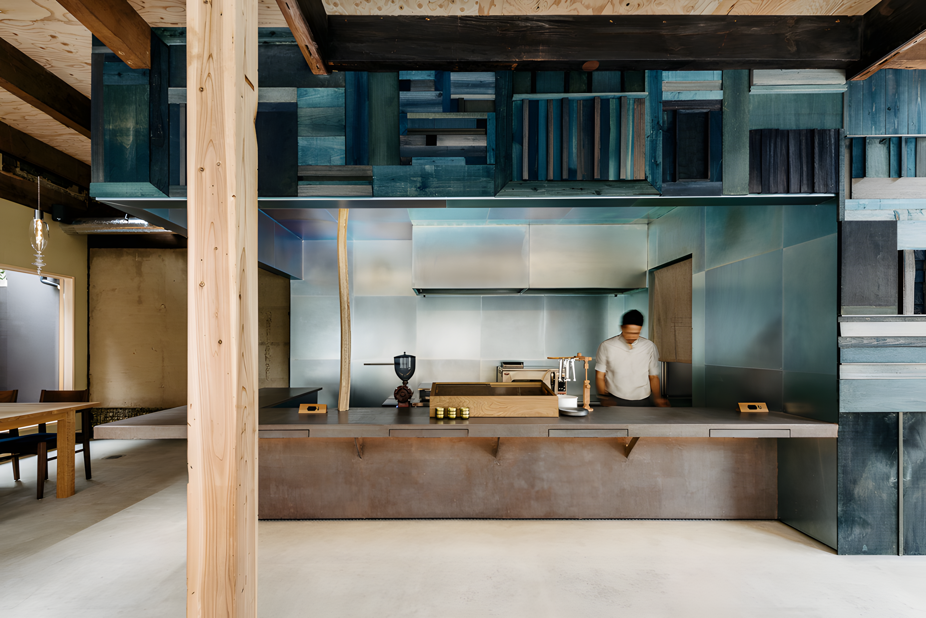 由日本設計師長坂常(Schemata Architects)操刀的 Blue Bottle Kyoto Café,同樣選址於百年町家。設計團隊保留木構屋架與原始結構,並以灰泥牆+拋光混凝土地坪+原木家具打造出柔和的層次。這是一種將現代日是室內設計語彙融入古建築的典範,整體色調低飽和,維持日本傳統空間的水平線比例,使空間即便簡約,仍有深度。