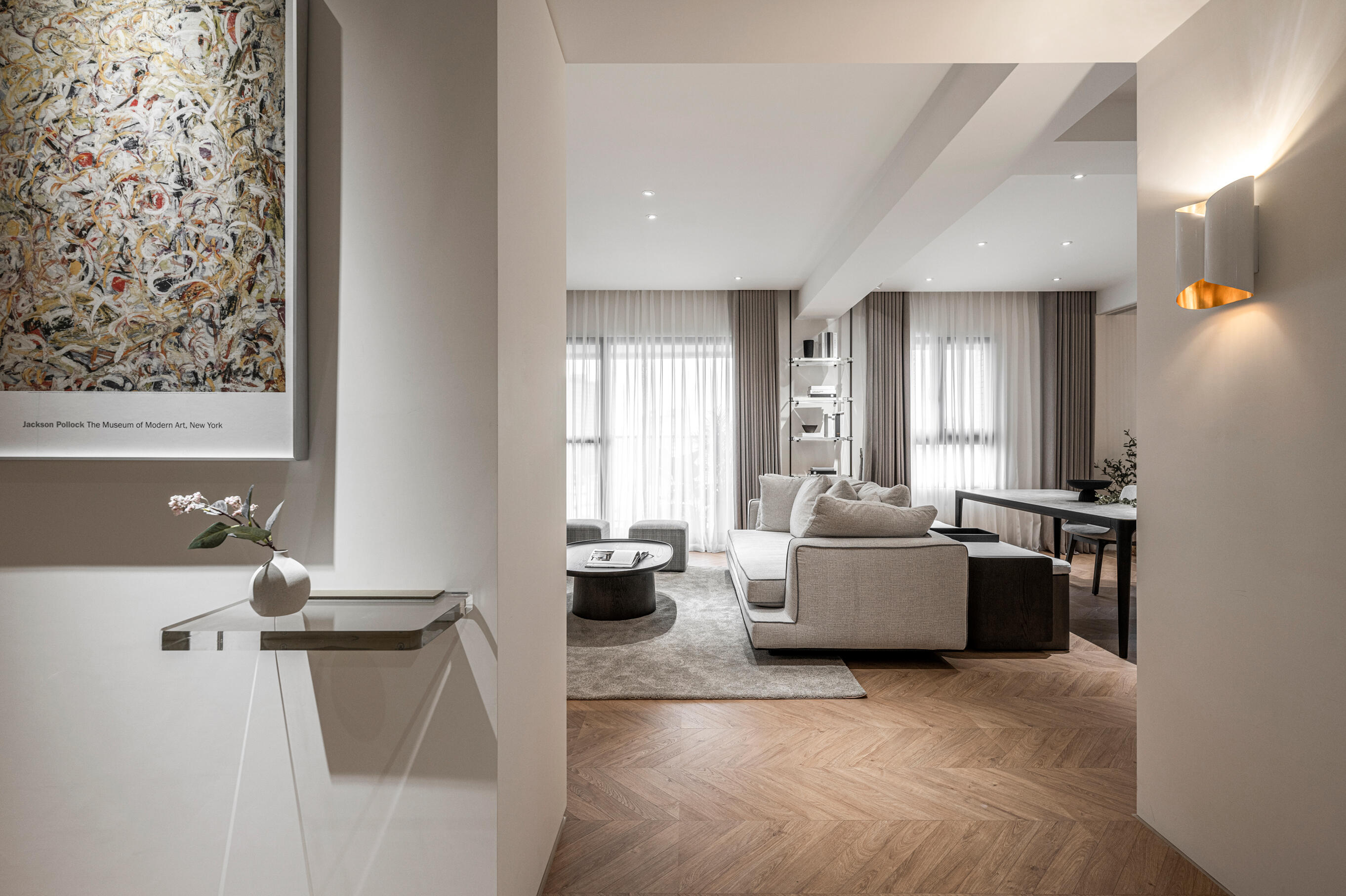 沿著人字拼花地板步入客廳,優雅的落地窗簾映入眼簾,大面落地窗引進充足自然光營造舒適潔淨的氛圍,半透明的立體白色窗簾感,其柔美的弧度為空間增添一抹浪漫氣息。