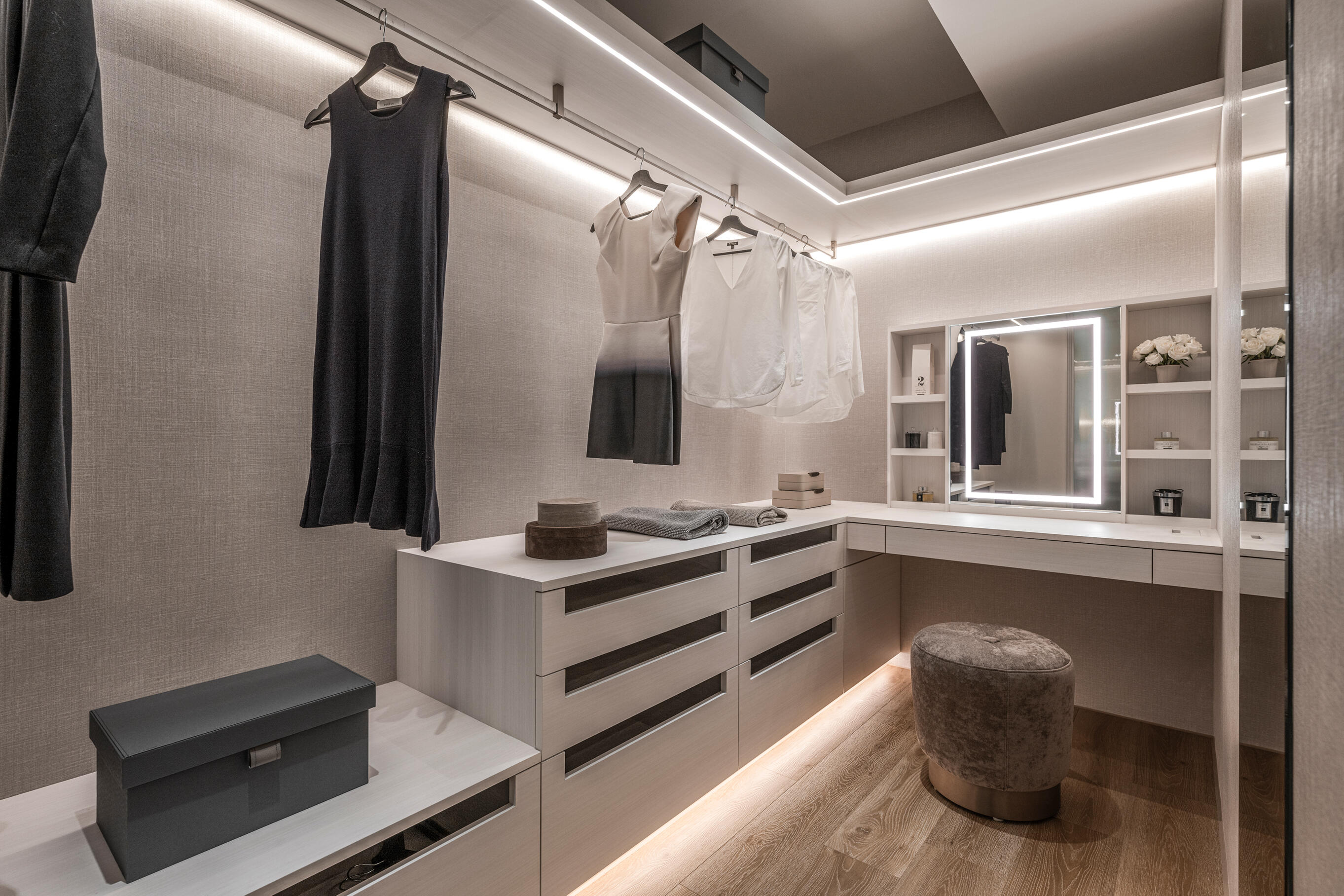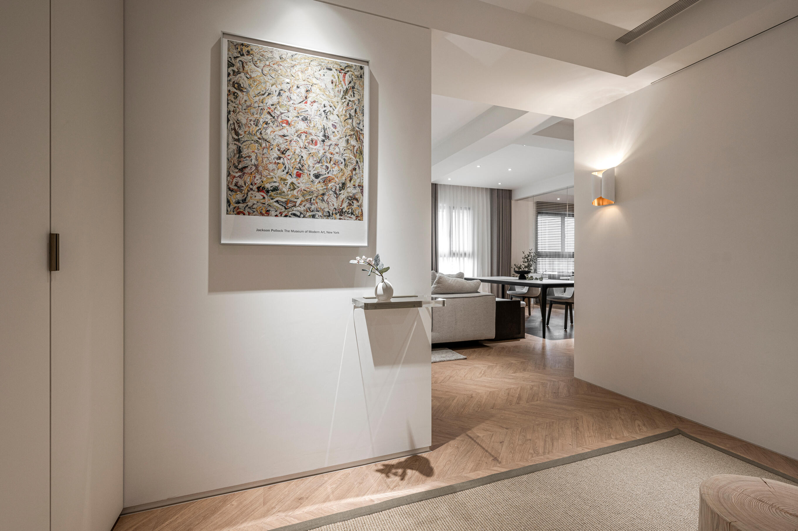 玄關以低調奢華的魚骨拼貼地坪迎接賓客,純白落地收納櫃與開闊空間相呼應,達到視覺上的延伸效果,營造別具美學感的玄關一隅。