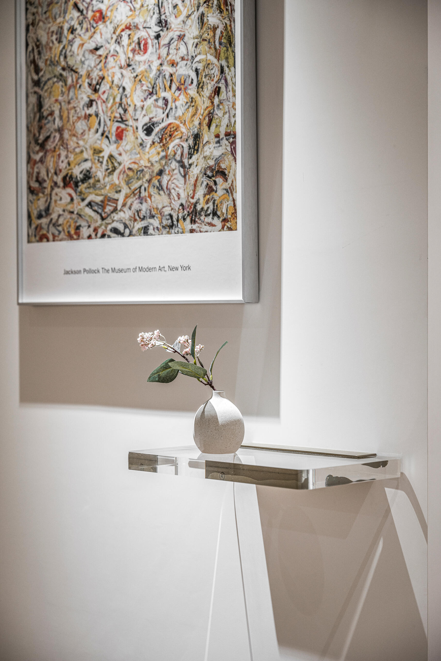 牆面上的藝術掛畫搭配下方壓克力層板,搭配純白色系的裝飾花瓶,在光線映照下,形成輕盈的展示空間,一進門便揭示屋主對於美學的獨到見解。