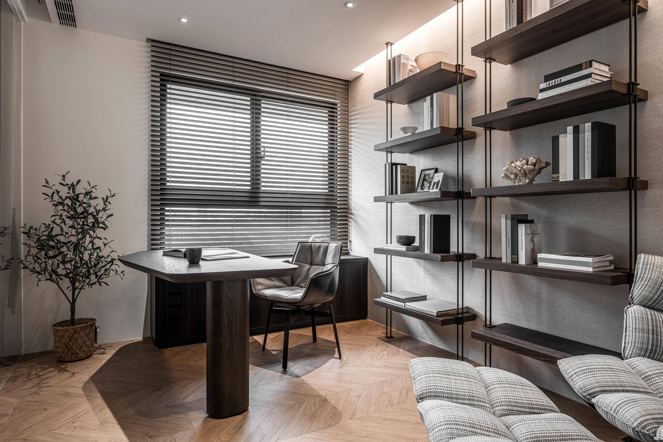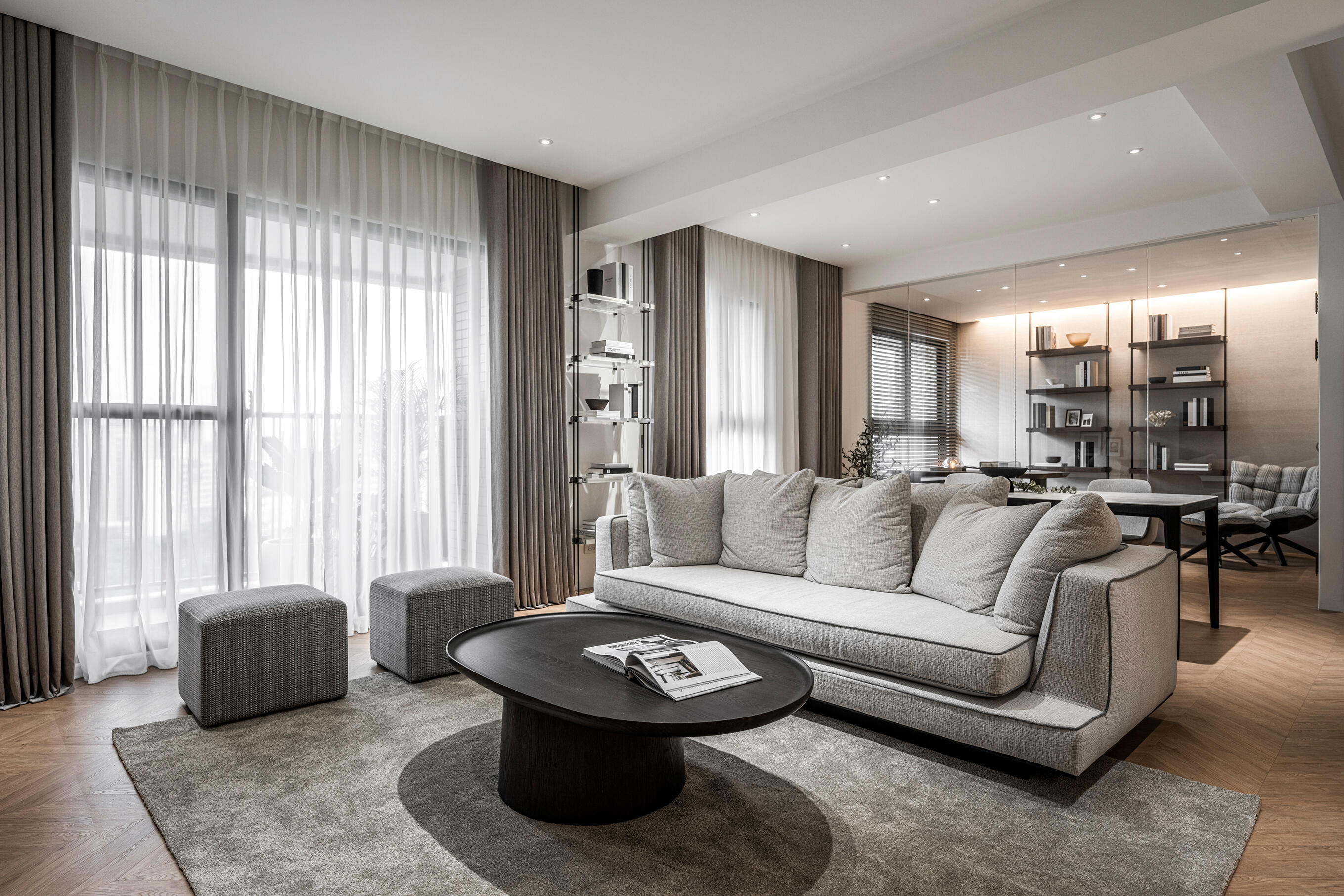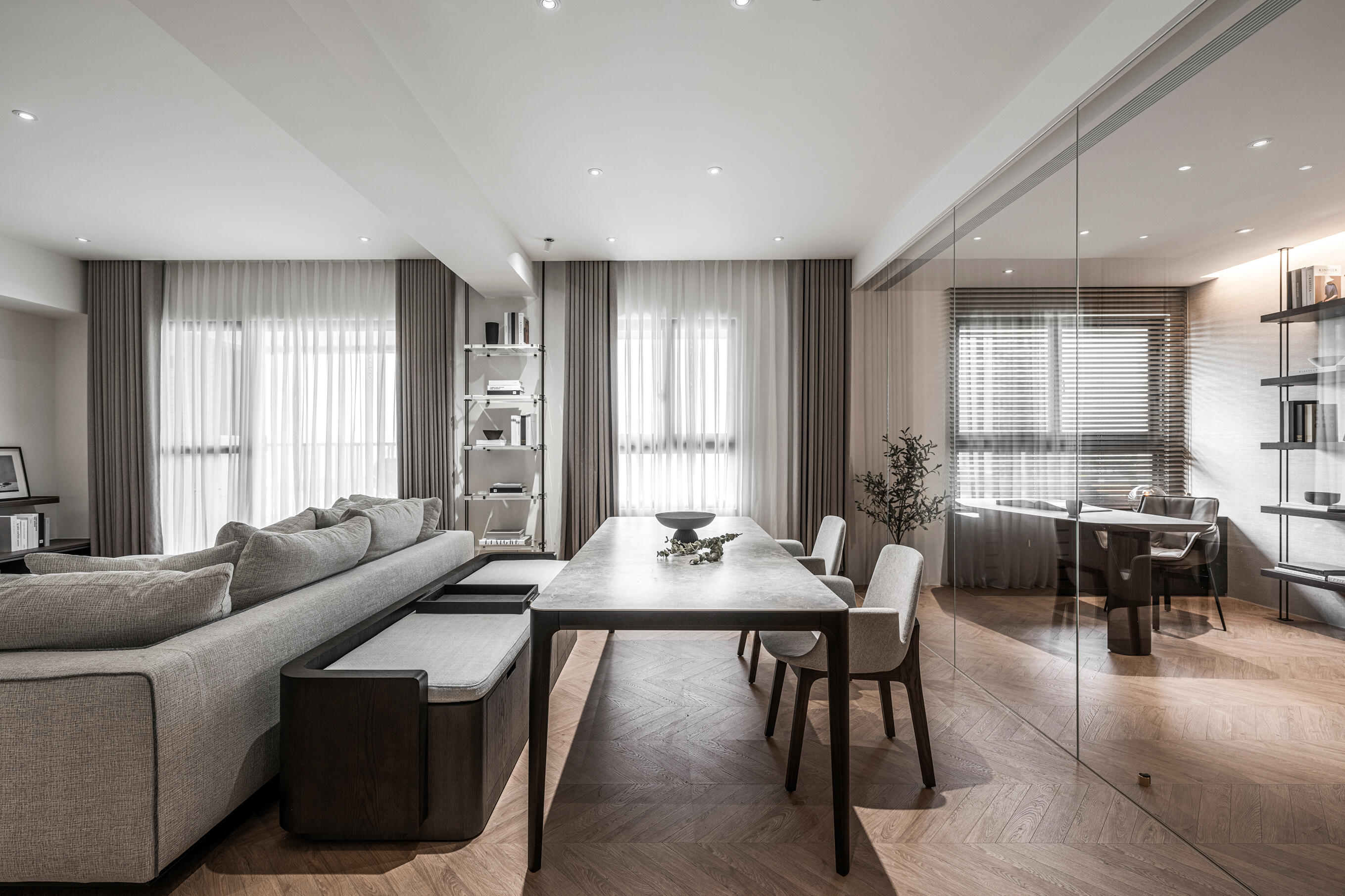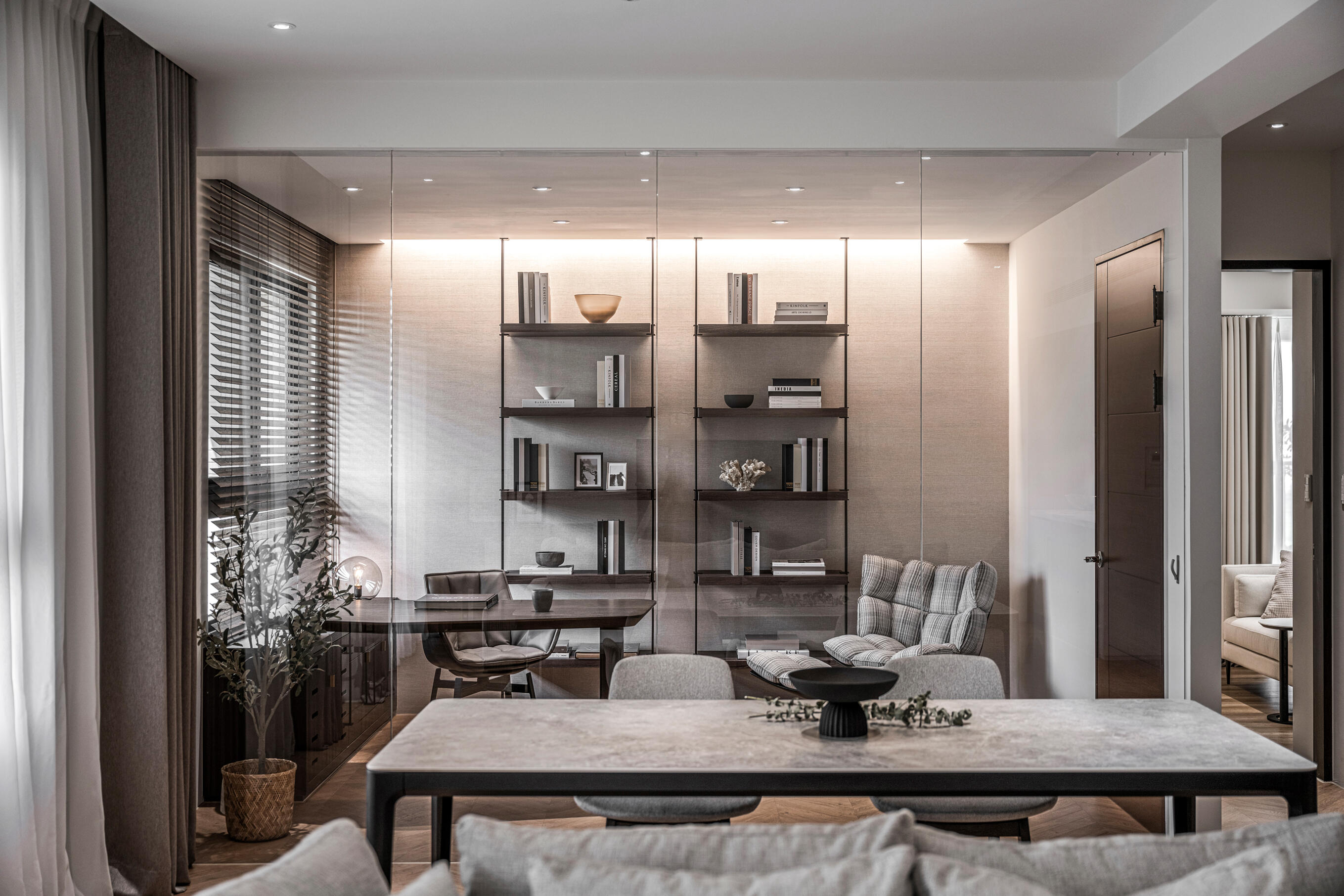捨棄傳統封閉式隔間,書房透過玻璃巧妙區隔客廳,既能維持空間的通透感,又能兼度私人領域的獨立性。寬敞的工作長桌搭配舒適的單人沙發,同時滿足辦公和閱讀的多元需求。