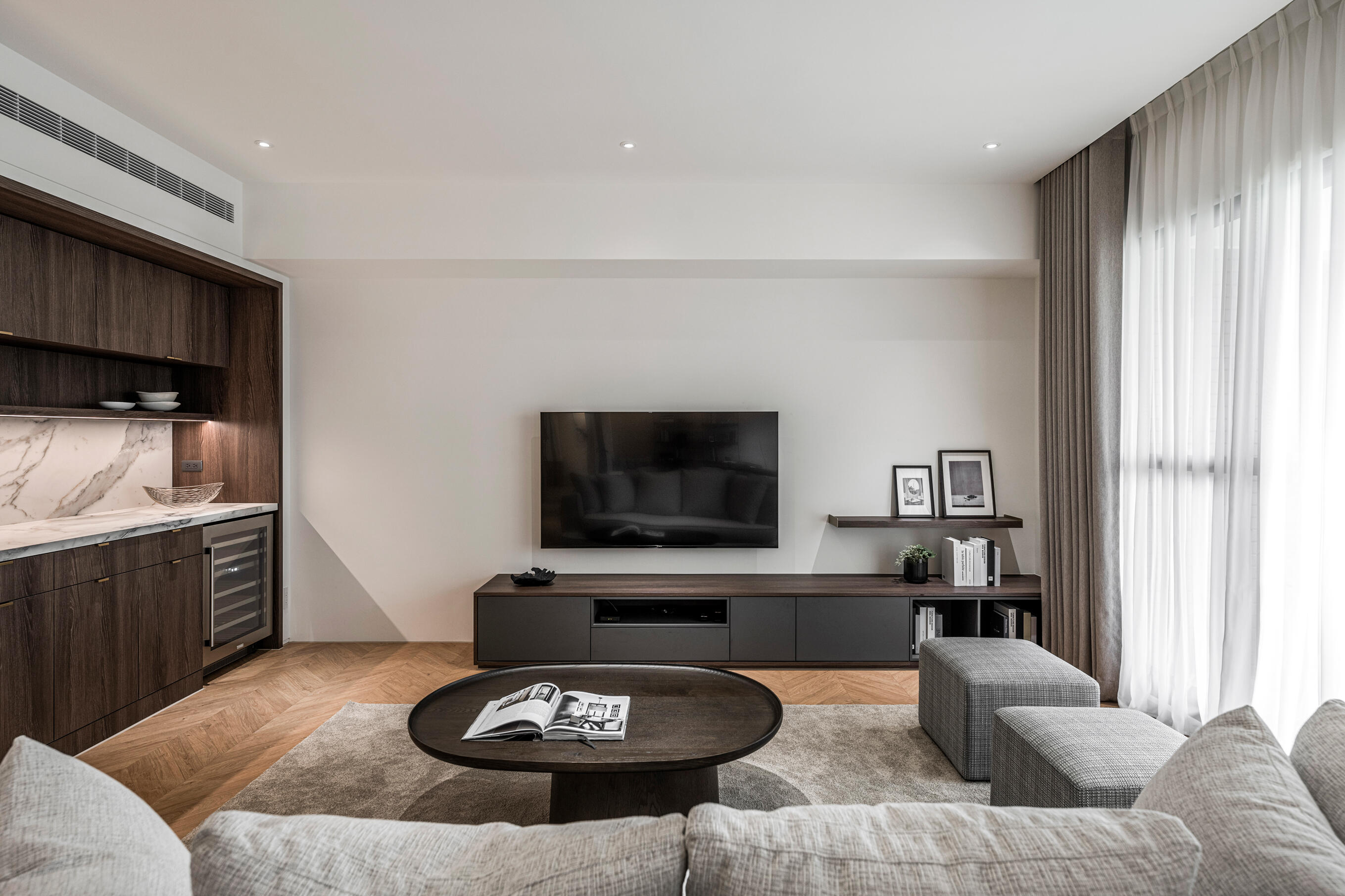 沙發旁的 mini bar,以復古煙燻木皮搭配復古白色石紋,在日常中注入法式儀式感,展現沉穩俐落的現代風格,體現出屋主對於生活品質的追求。
