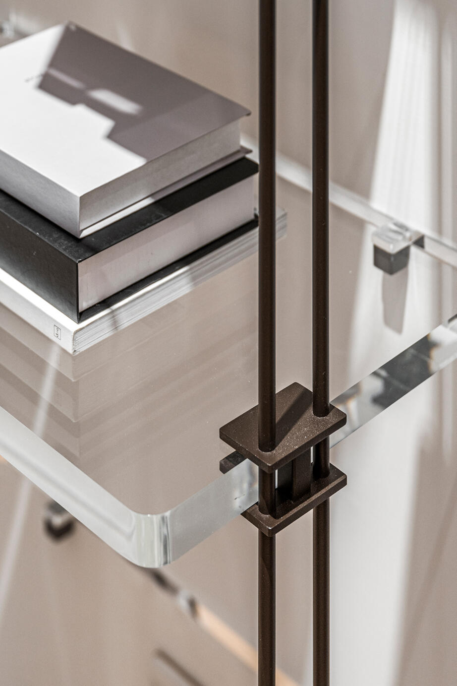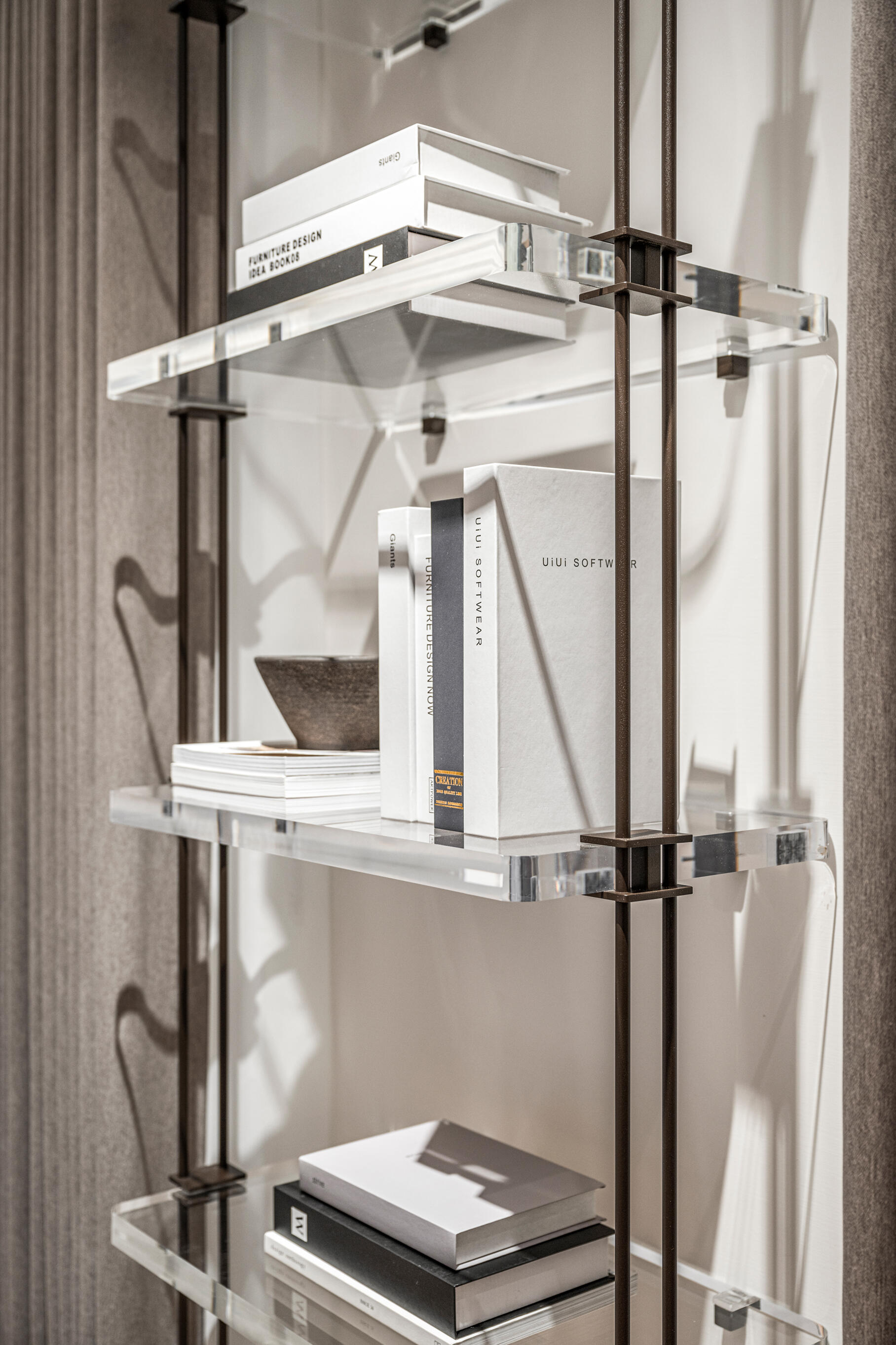 靈感源自法式水晶吊燈的壓克力層架,設計師巧妙地將流光溢彩的水晶轉換成書架,運用纖細鐵件與透明層板完美結合,不僅能減少視覺上的沉重感,還能營造出空間的輕盈與立體效果。輕盈通透卻承重力十足,是令人驚嘆設計的巧思。