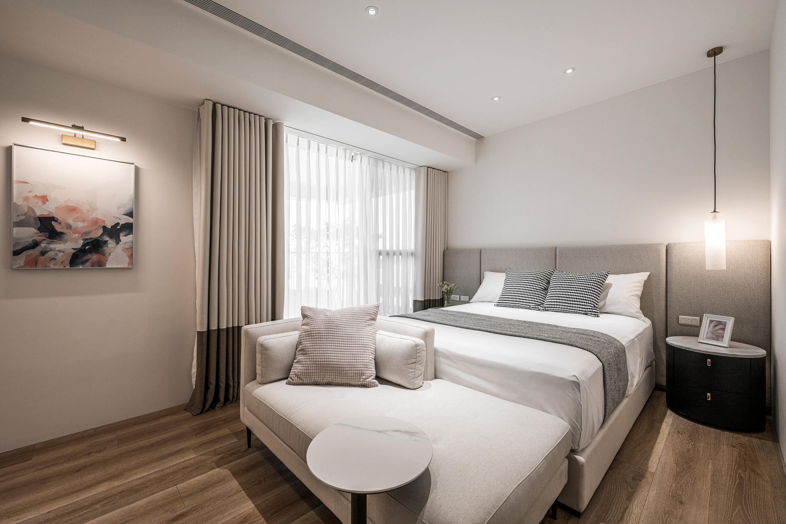 主臥室以淡雅色調營造寧靜舒適的休憩氛圍,捨去繁複的設計,回歸睡眠空間的本質。搭配精心調配的間接照明,無形中提升睡眠品質,讓身心靈得到充分放鬆。這樣的設計使主臥室保留了純粹的空間感,讓每一個夜晚都能擁抱深度睡眠的美好時光。